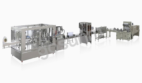 生產流水線由自動沖瓶機、常壓灌裝機、自動旋蓋機燈檢機、套標機縮標機、熱收縮膜打包機及成品輸送機等系列產品組成。本機沖洗、灌裝、封口、套標、收縮包裝等主要關鍵部位均采用優質不銹鋼材料制成,具有工藝先進、系統完善、性能可靠、使用方便等特點。